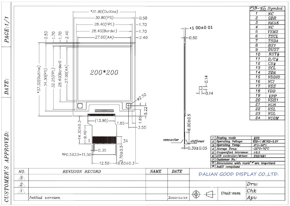 | GDEW0154T11 | BW | UC8154 | 200x200 | SPI Interface | 2s |