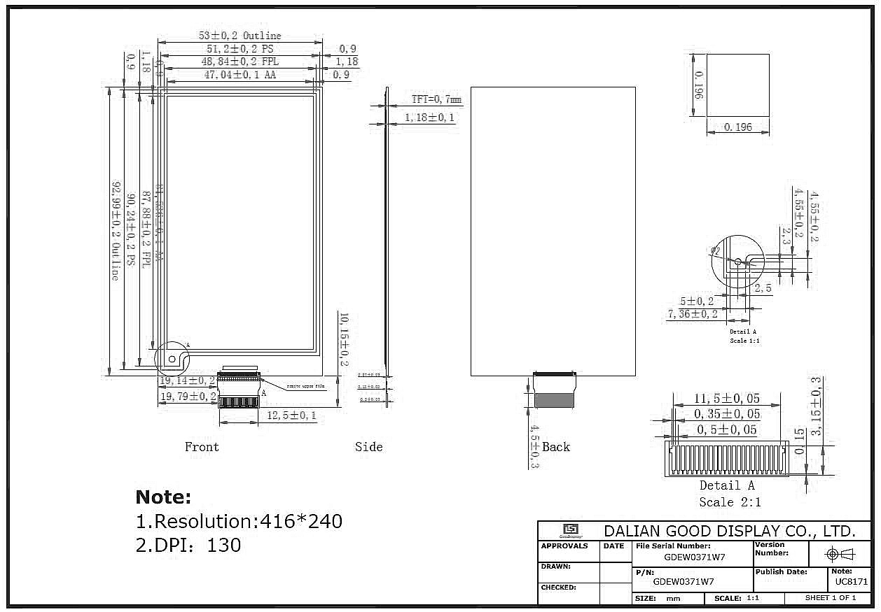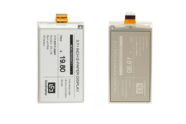 This is a e-paper display e-ink screen, 3.71 inch, with 416x240 resolution, SPI interface, and the display is capable to display images with black and white content. Your image holds indefinitely without power – put up your image, then shut down the power. Once these e-paper modules are updated they don't require any power and can actually be disconnected entirely and the content will remain on the display indefinitely. This e-paper display GDEW0371W7 is perfect for low power devices powered by solar or batteries.