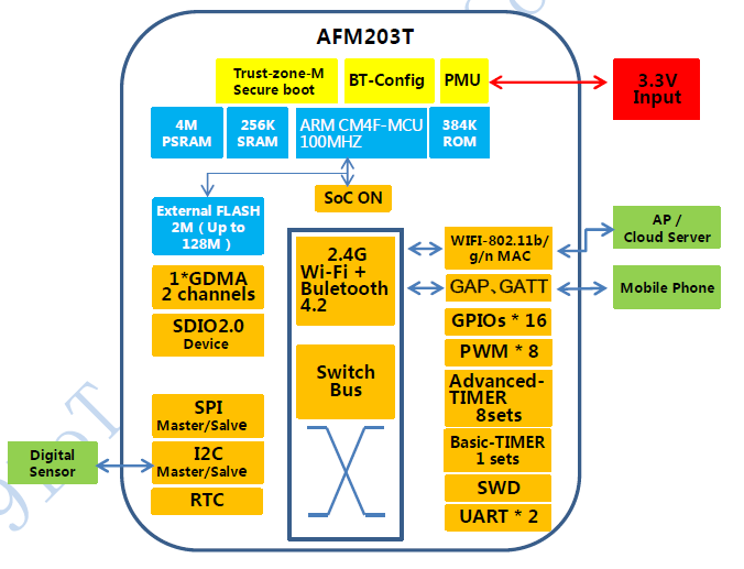 AFM203T is a low-power and small-volume embedded Wi-Fi + Bluetooth module. It uses Realtek's highly integrated wireless RF chip RTL8720CM and a small number of peripheral devices. The chip has built-in 802.11b / g / n Wi-Fi wireless Built-in ARM Cortex-M4F processing core, with large capacity (FLASH: 2MB ROM: 384KB) storage space (FLASH: up to 128MB), running space (SRAM: 256KB) and rich peripheral resources, RTOS system platform in MCU And the lightweight LWIP protocol, through packaging and optimization of the SDK, can meet a variety of embedded wireless communication applications.