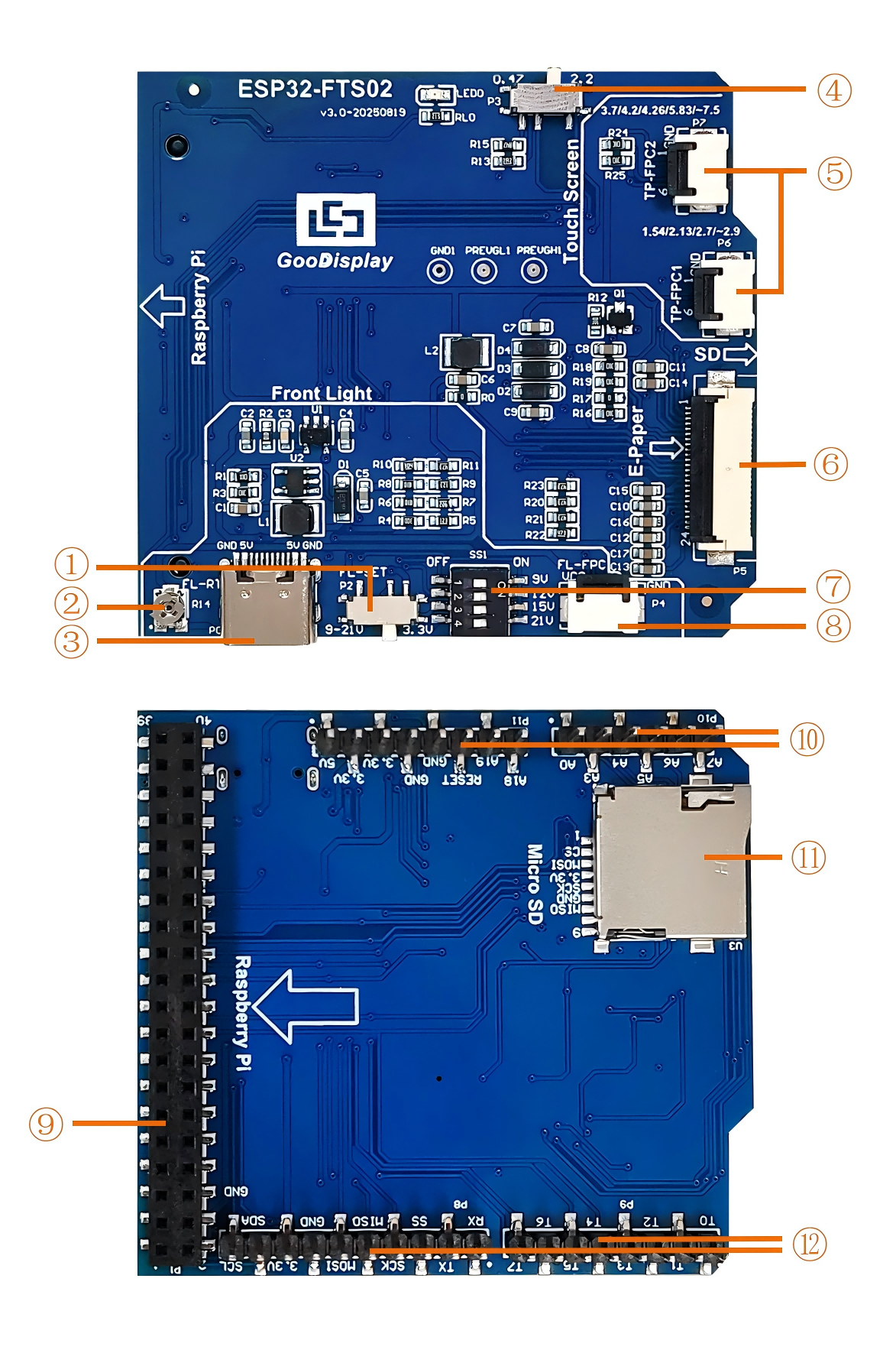 ESP32-FTS02 is a compact, all-in-one adapter board designed for SPI e-paper displays. It integrates front light, touch panel support, and micro SD storage, while seamlessly working with Raspberry Pi and ESP32-L boards.