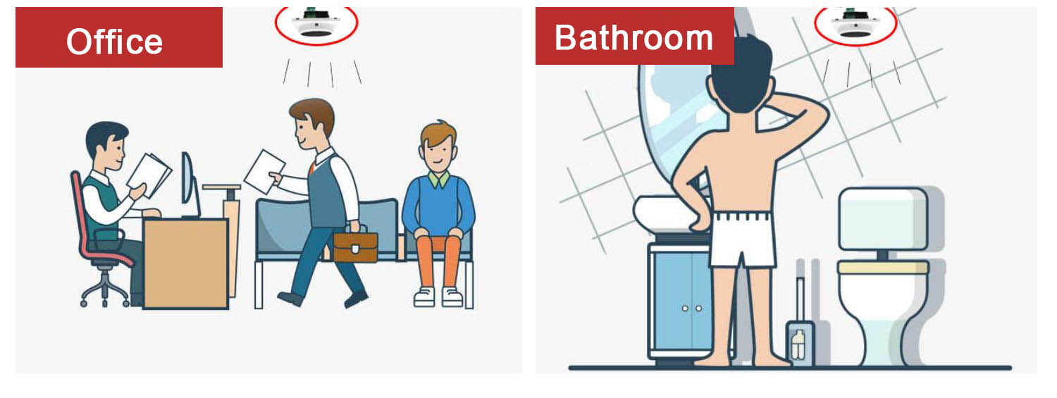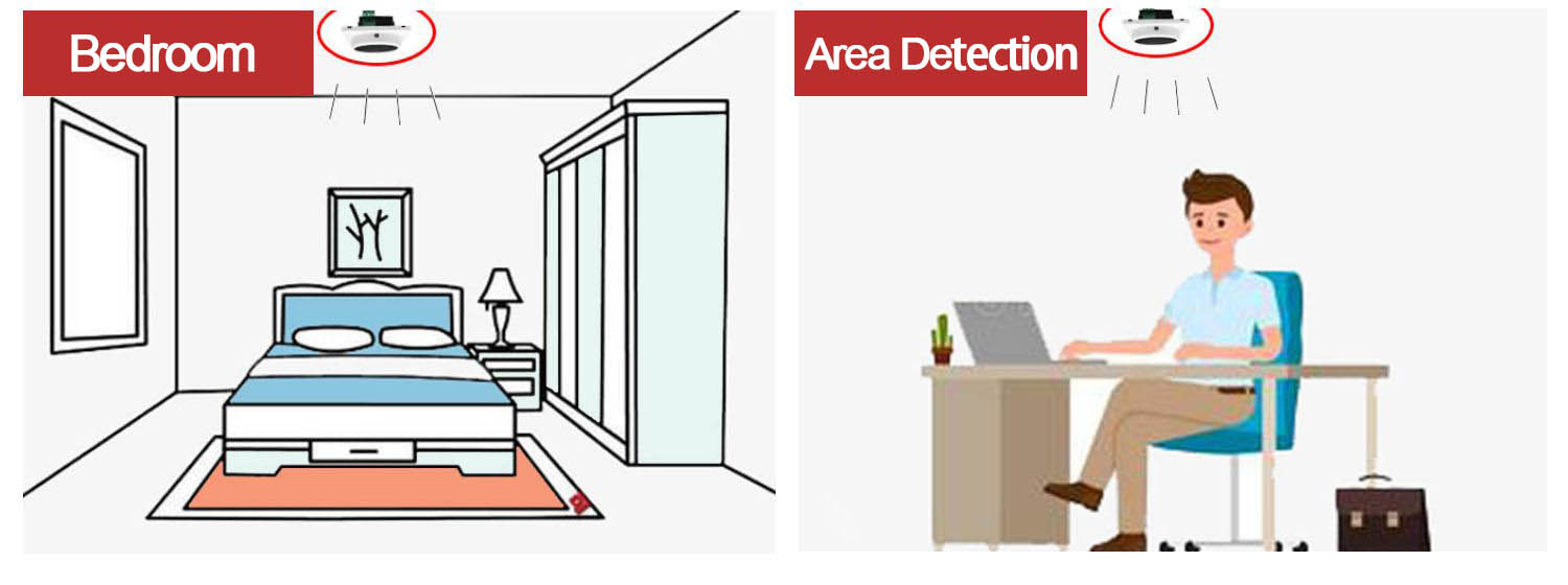 The range when the ceiling installation radar detects human activities is about 6X8m, the range when the human body is stationary is about 4X6m, and the range when scanning sleep is 3.6X2.2m. The radar installation location needs to be designed according to the room structure.