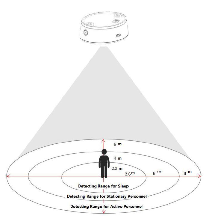 The detecting range of human activity for to p-mounted is about 6m * 8m, the detecting range of stationary human body is 3m * 4m, and the scanning range of human body in sleep is about 3.6m * 2.2m.