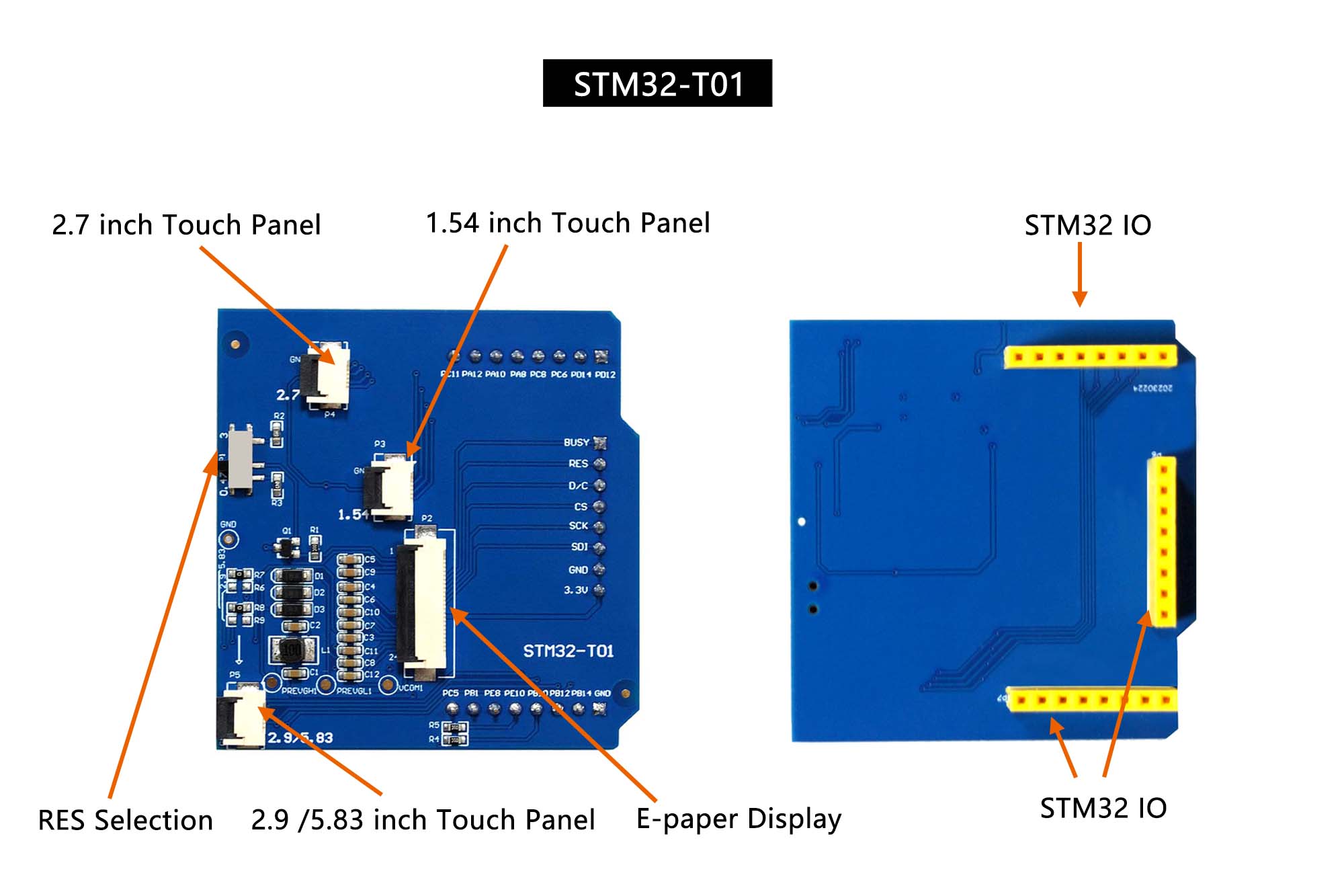 STM32-L(T01) development kit is used to help users develop epaper display projects with provided source code to create more differentiated solutions. It is designed for SPI e-paper display. It support USB to serial port, LED indicator, reset key, user-defined button, font chip, FLash chip and other functions;support via PC software to control e-paper display.
