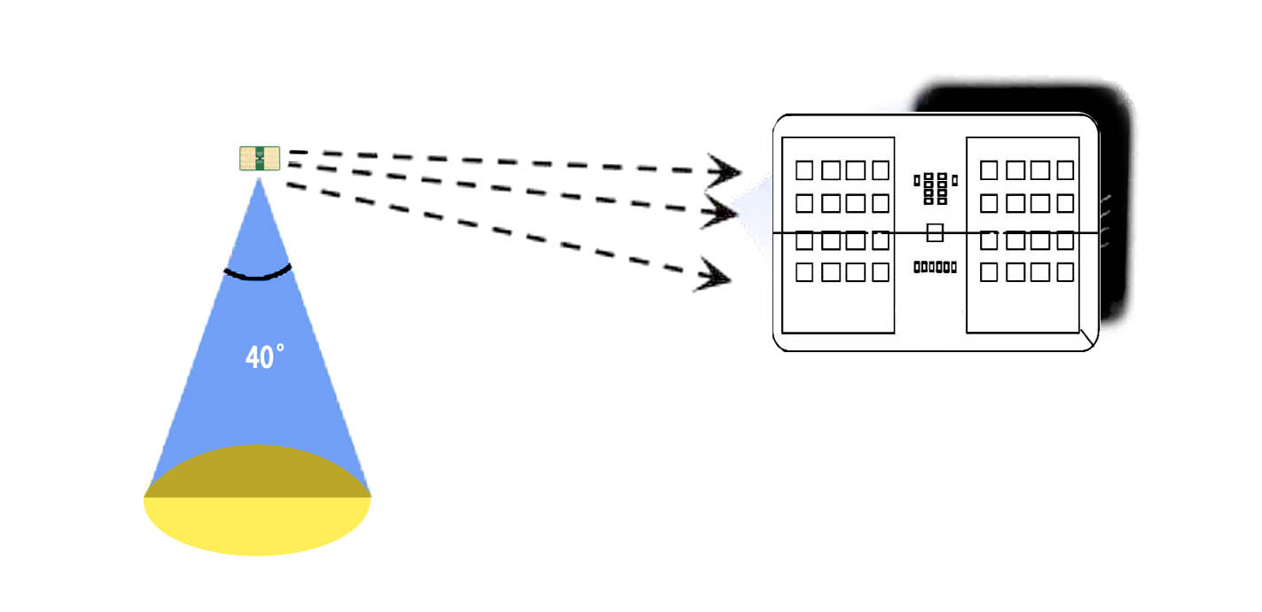 The beam coverage of IR24BDA radar module is shown in the figure. The coverage is a 3D fan-shaped area, horizontal 40°, pitching 40°.